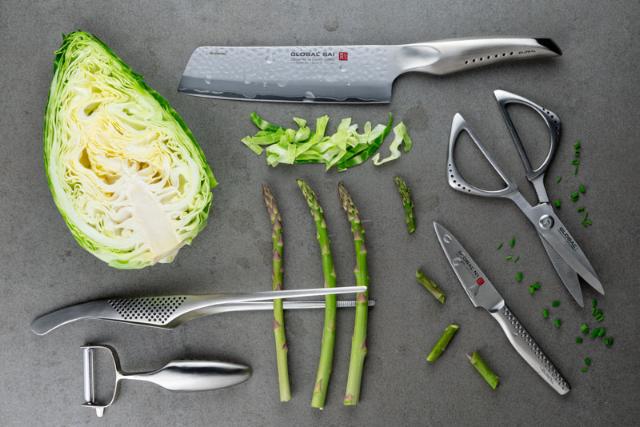 Klipp og kutt! Global kjøkkensaks har en mikrotannet egg. Saksen er utmerket å bruke til alle grønne urter i grønnsakshagen, også gressløk og persille.