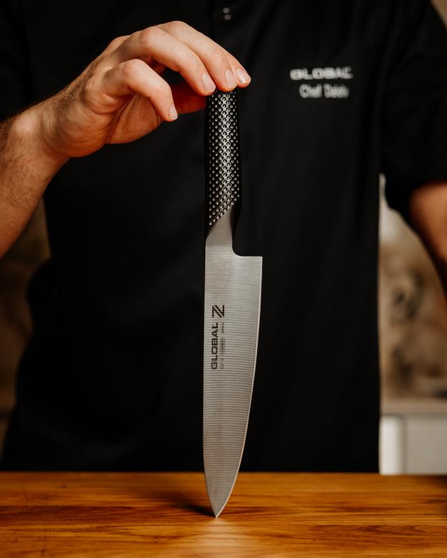 Kokkekniven i Global Z-serien bygger på den ikoniske modellen G-2. Den har samme kjernestål og velkjente design, men med nytt særpreg og kraftfull karakter. Det svarte belegget gir mer enn et elegant uttrykk, det gir også praktiske fortrinn og en unik opplevelse på kjøkkenet.