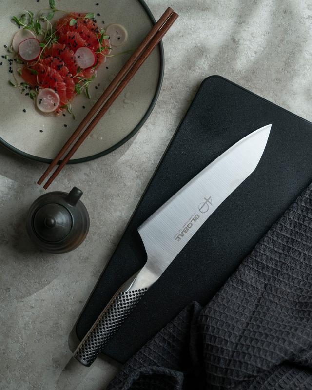 Globals jubileumskolleksjon vokser! Fra og med i høst vil også kokkekniven fra jubileumssettet bli solgt i egen forpakning. Dette er en japansk-inspirert kokkekniv som mestrer å skjære, hakke og terne de fleste råvarer. Bladet er preget med Globals unike 40-årsjubileumslogo.