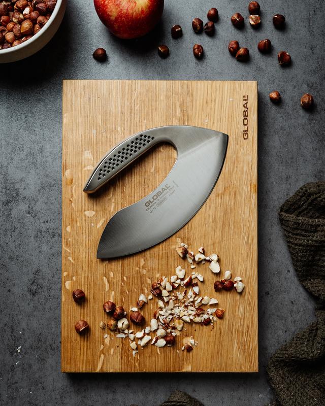 Glem tidkrevende hakkearbeid! Med Globals nye urtehakker kan du enkelt finhakke friske urter, krydder og nøtter. Alt du trenger å gjøre er å bevege denne elegante hakken fram og tilbake over skjærebrettet, så blir ingrediensene dine finhakket på null tid.