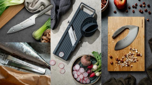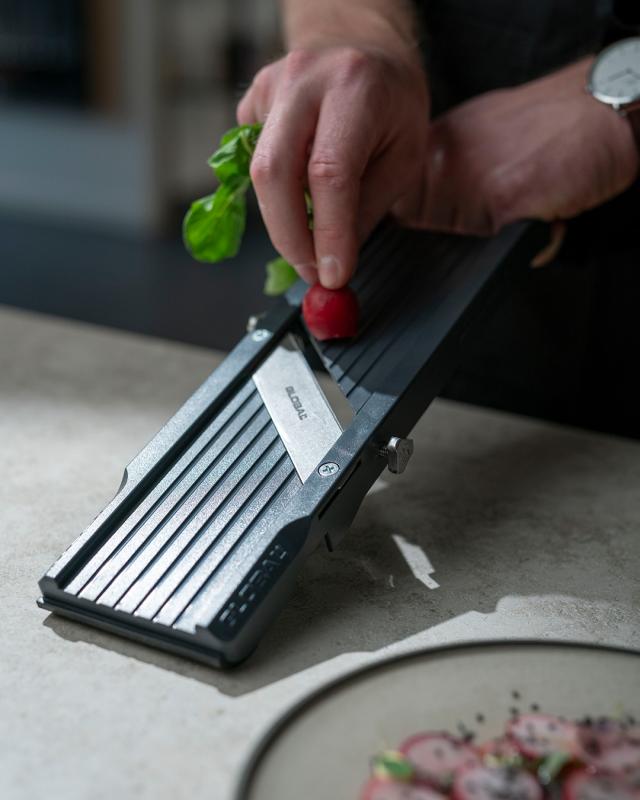 Globals nye mandolin er et must på et hvert kjøkken. Den er utrolig effektiv å jobbe med og like skarp som en japansk kokkekniv. Det faste, rette bladet gir deg perfekte skiver eller strimler av grønnsaker og frukt. Mandolinen selges i to størrelser.