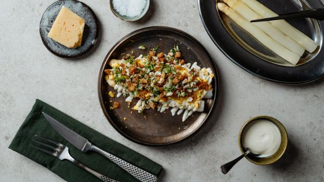 Hvit asparges med fastostkrem, egg & brødsmuler