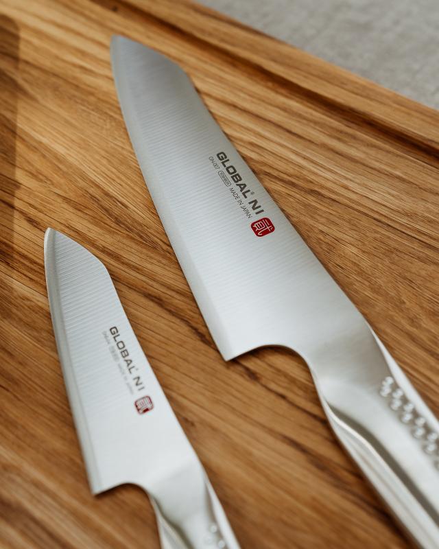 Globals to-deler knivsett i Ni-serien inneholder en stilren santokukniv og en praktisk universalkniv. En elegant duo som er en flott gave å gi bort. Perfekt til paret som elsker å lage mat sammen.
