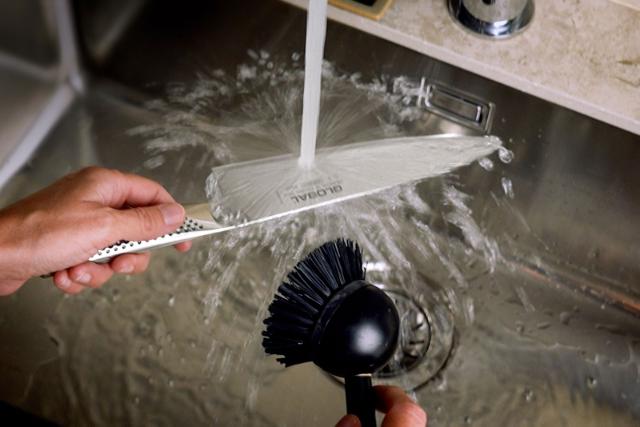 Ikke la kniven ligge uvasket. Vask kniven for hånd med vann og litt oppvaskmiddel, og tørk den med et kjøkkenhåndkle umiddelbart etterpå. Aldri bruk oppvaskmaskin – verken kniven eller maskinen tåler det. Oppvaskmaskinmiddel kan også skade kniven.